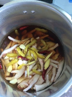 冷水,放入鸡爪和所有配料,盐,白糖,味精,料酒大火煮10分钟。
