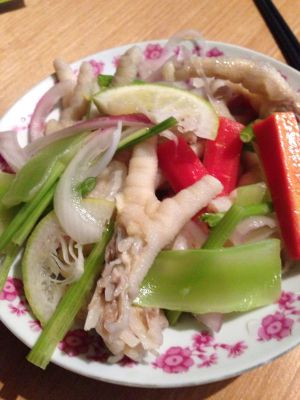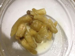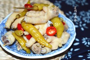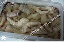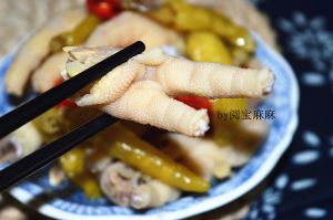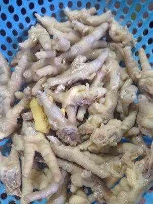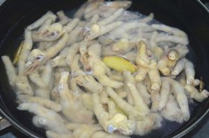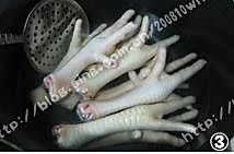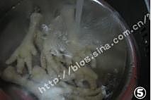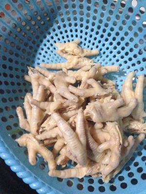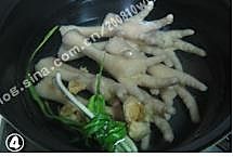 大概10分钟,视火候成度把握时间(用手捏一下鸡脚尖出,烂了即是熟了)。 捞出后用净水冲洗,然后晾干