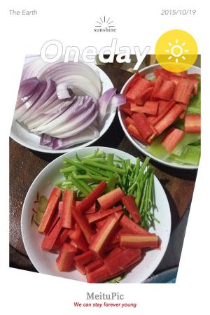 把洋葱切丝,胡萝卜、莴笋切片,芹菜切段,放在一边备好。