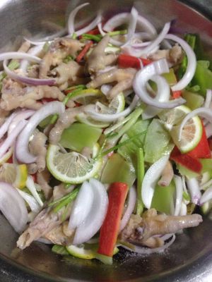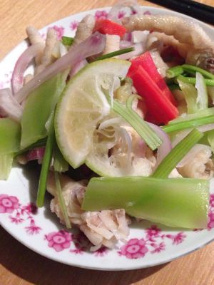 准备个干净的容器醃鸡爪,原博说最好用密封的,家里木有,我用了大玻璃碗!放入沥干水的鸡爪,半个洋葱,半个柠檬,八角、姜片、蒜片、干辣椒、花椒、小米辣、白醋2大勺、适量白开水,没过鸡爪即可!