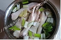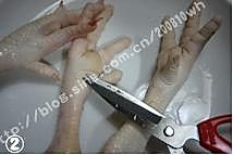 清水中加入拍碎的葱段、姜片以及料酒,将买回的鸡爪冲洗后放入浸泡2-3个钟备用;将浸泡好的鸡爪进行处理:剪去指甲,将黄色的茧皮撕干净(浸泡好的茧皮特别容易处理,轻轻一撕便可)