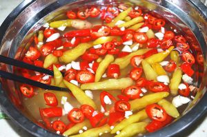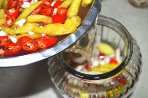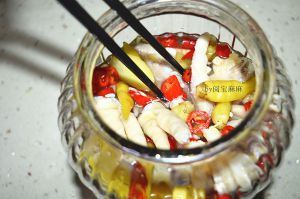清水半碗加入生姜片,花椒煮开后摊凉,倒入半碗瓶装泡椒及泡椒水,试试味,再添加糖、白醋、盐,1勺白酒,或酸或甜根据个人口味调整,将以上材料混合均匀即可。