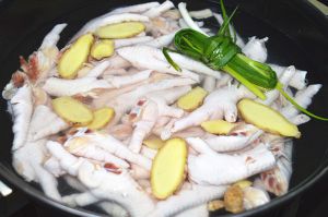 另起锅,清水中加入料酒、生姜、葱结,将3中鸡爪放入,大火煮开后转小火约10分钟熄火(注意煮的时候不要锅内翻搅以免伤皮);