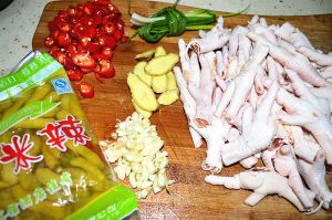准备所有材料;(将鸡爪去指甲,切成两半,生姜切片,葱打结,大蒜切末)