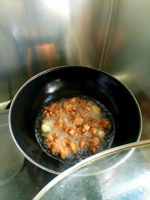 鸡块熟了后,放土豆继续炒,然后再蒜,姜,泡椒,最后放辣椒等调料。放盐。