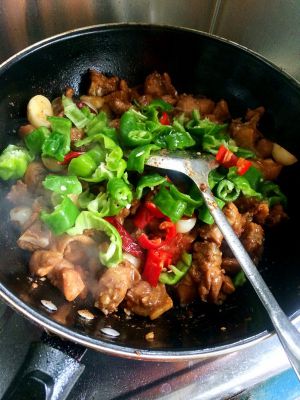 最后加入绿辣椒、红辣椒,翻炒!加少许生抽、胡椒粉、调味!尝尝味道是否够,不够加盐!