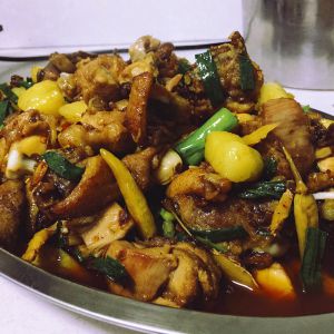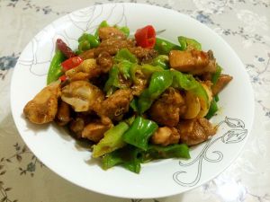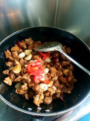 重新放点油,加干辣椒煸炒,放入鸡块,再加入去皮西红柿一个!