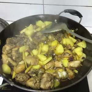 倒入刚炒好的土豆鸡丁 翻炒均匀 调味