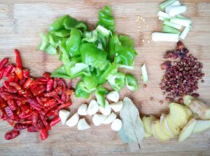 油炸过程中准备配料,生姜切片,干湿辣椒去籽切开,八角掰开,蒜子切开,香葱切段,香叶2-3片,青椒切丁,花椒适量,备用。
