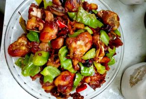 接着放入鸡肉炒一会,再加入葱段和青椒。继续翻炒。