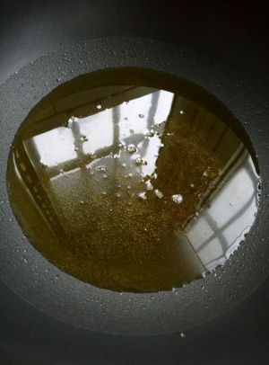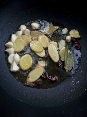 保留少许油,依次加入生姜,大蒜,八角,香叶,爆香。