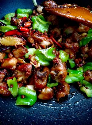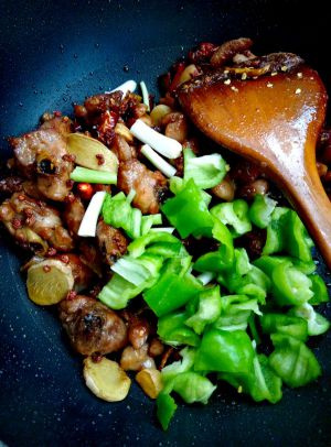 锅中加菜籽油而且一定要多喔,根据鸡肉来定,油烧好放入姜蒜花椒,炒香鸡肉放入进行翻炒,火力要猛,直至鸡肉炒干,倒入干红海椒,最后放青海椒,炒5分钟左右就加少量盐和鸡精。起锅!