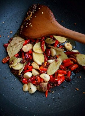 锅留底油,放花椒和蒜姜末炒香,再放一勺豆瓣酱炒出红油。