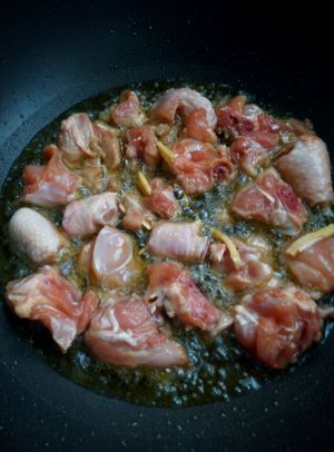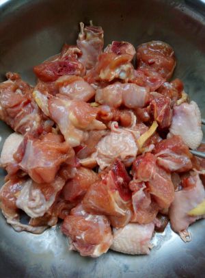 鸡大腿洗净,沥干水分后切丁,不要太小,加生姜、料酒、盐、生粉,腌制一个小时。