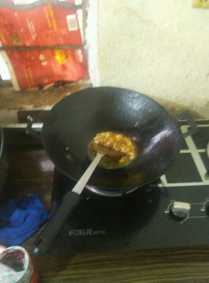倒入适量油,麻婆豆腐可多放点油。待油烧热,加入一勺郫县豆瓣,姜蒜花椒一起倒入,炒香,再加入肉末。