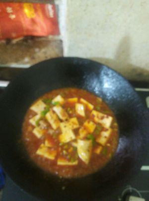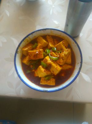 把豆腐切成小块,放在空盘子备用,之后把麻婆豆腐酱均匀撒在豆腐上,之后放入微波炉转两分钟,一道菜就ok啦!出炉后再撒点葱花就可以了