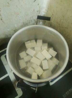 豆腐切成2×2cm的小方块,放入锅中加水,水烧开即可,这一步是为了去除豆腐的豆腥味。