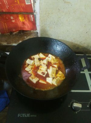 待肉末变色,即可加入豆腐并加入少许水,水超过豆腐即可。