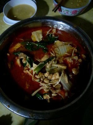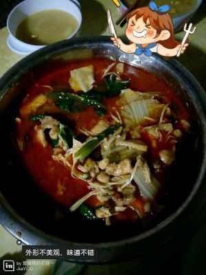 1,烧开水,加点盐,把油菜,金针菇,娃娃菜,从热水焯一遍,加盐为了菜的叶子颜色能保持住,腐竹泡好,配菜就是喜欢吃啥加啥,然后把这些都放在一个盆里备用