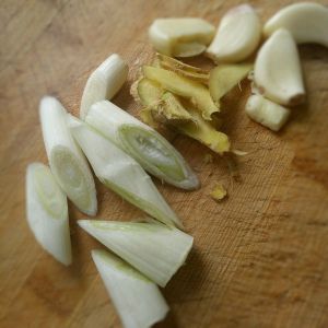藕去皮洗净切片,香葱叶切粒,蒜切蓉,干小米椒切段。