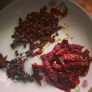 再次锅内放多油,烧热,放入辣椒,麻椒等至香味出,热油倒入肉片上