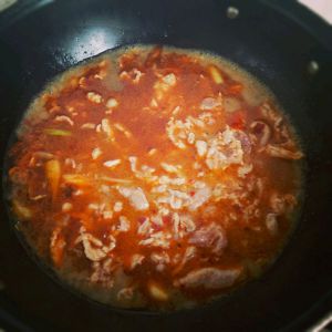 放入腌制好的肉片,大火煮至肉熟,放入酱油,少量盐,鸡精