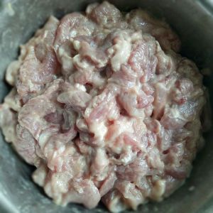 将猪里脊切片,用酱油,十三香,蛋清,淀粉抓匀,腌制!