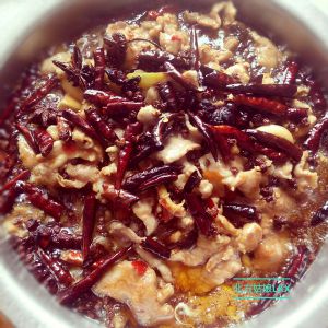最后,锅里放油,将干树椒炸香,淋在肉上,放上香菜,大功告成!