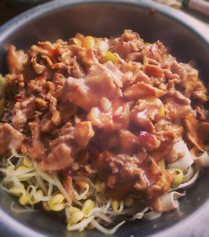 把腌制好的肉,放水,豆瓣辣酱煮熟,一起倒入碗里