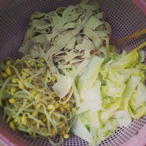 豆芽,千张,白菜洗净,沸水煮七分熟,捞出放入大盆中备用