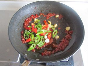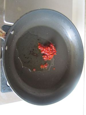 烧热锅, 放少许油,下入豆瓣酱翻炒;