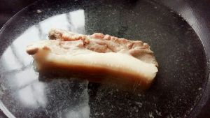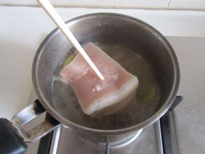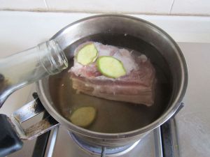 五花肉冷水下锅,加入适量的水和料酒, 几片姜;