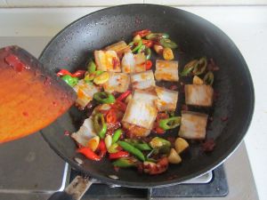 放入生姜和泡椒,继续翻炒