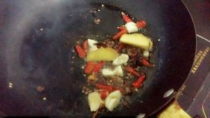 多的油倒出来,留少量油就可以,再加入蒜,姜,花椒,八角,干辣椒等,煸香