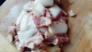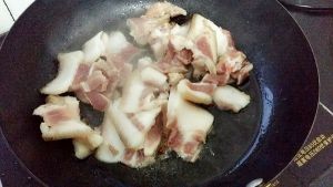 锅里放入少许油,烧到五成热,放入五花肉煸炒,直到五花肉的油分炒出来