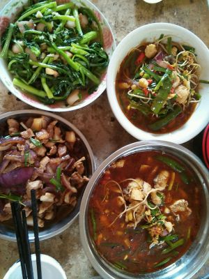重点部分,热锅加油,葱段,姜片,蒜片,八角,花椒,干尖椒,爆香,加入一小块火锅底料,豆瓣酱适量,水少量煮开。