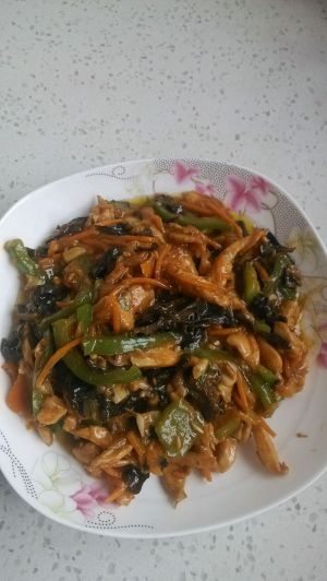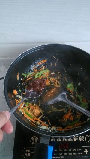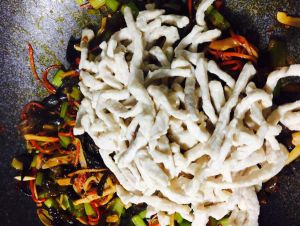 加入肉、木耳丝、胡萝卜丝,一起炒。