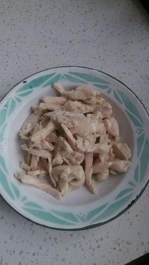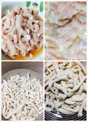 鸡脯肉切丝用盐,淀粉,色拉油煨一会儿