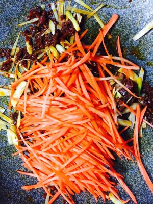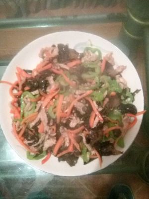 胡萝卜、木耳、瘦肉、青椒,切丝。(忘了拍照了以后补上)