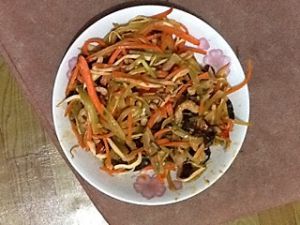 放入青笋丝,茭白丝,胡萝卜丝一起翻炒