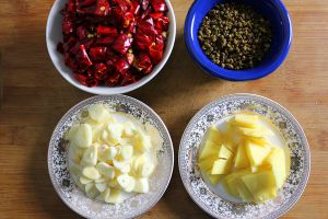 叧起锅加适量油,待油热后放花椒八角干辣椒煸出香味