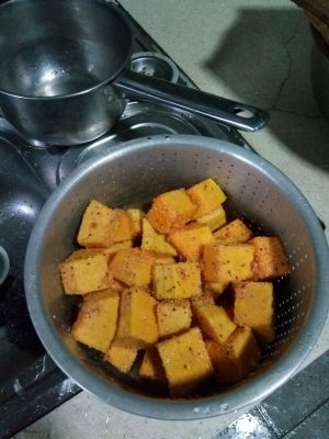 南瓜切成1寸见方的块加盐蒸肉粉适量垫底