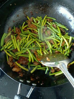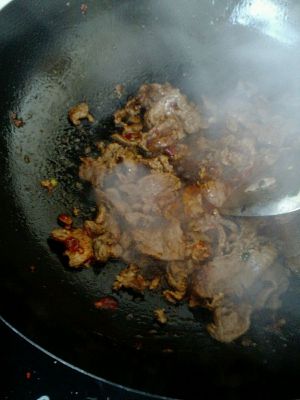 肉炒好了 豆瓣放进锅里 然后放酱油