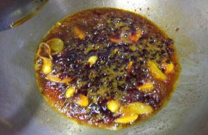 锅刷干净,坐油,下花椒十几粒,油热后快速倒在干辣椒段等上面。