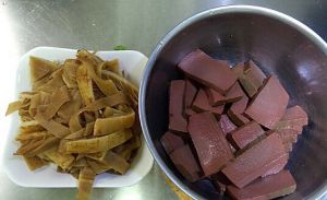 鸭血和午餐方火腿切片切成约5CM厚的大片。百叶洗净,切成梳子形的丝。黄豆芽洗净,干辣椒用剪小段倒出籽,小香葱切碎,大葱分别切成葱花和葱段。