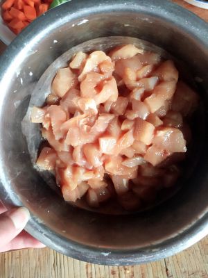 鸡胸肉切丁,放入淀粉,2克盐,少许水,腌制备用。(冷冻鸡胸肉,在不完全解冻的情况下切丁,比较好切哦)