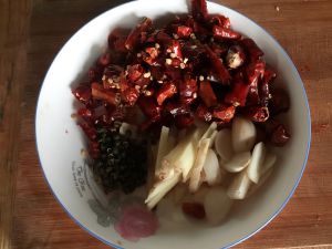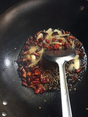 把姜、蒜、花椒和干辣椒倒入锅中(注意不要炒糊了)