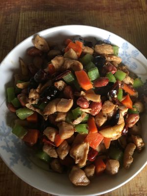 倒入黄瓜,胡萝卜,葱白丁翻炒,再倒入鸡胸肉,炸好的花生米,然后把调好的料汁倒入锅中翻炒上色。