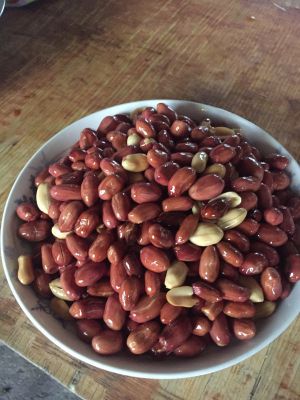 油炸花生米:锅中放少量油,凉油放入花生米小火不断翻炒,炒熟。