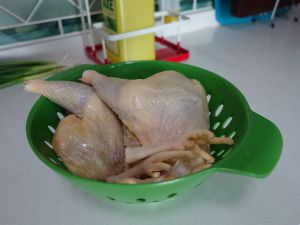 光鸡收拾干净,为方便煮制,我把它斩成了两半。